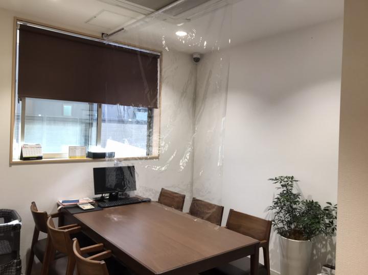 お打合せテーブルの間の透明カーテン |